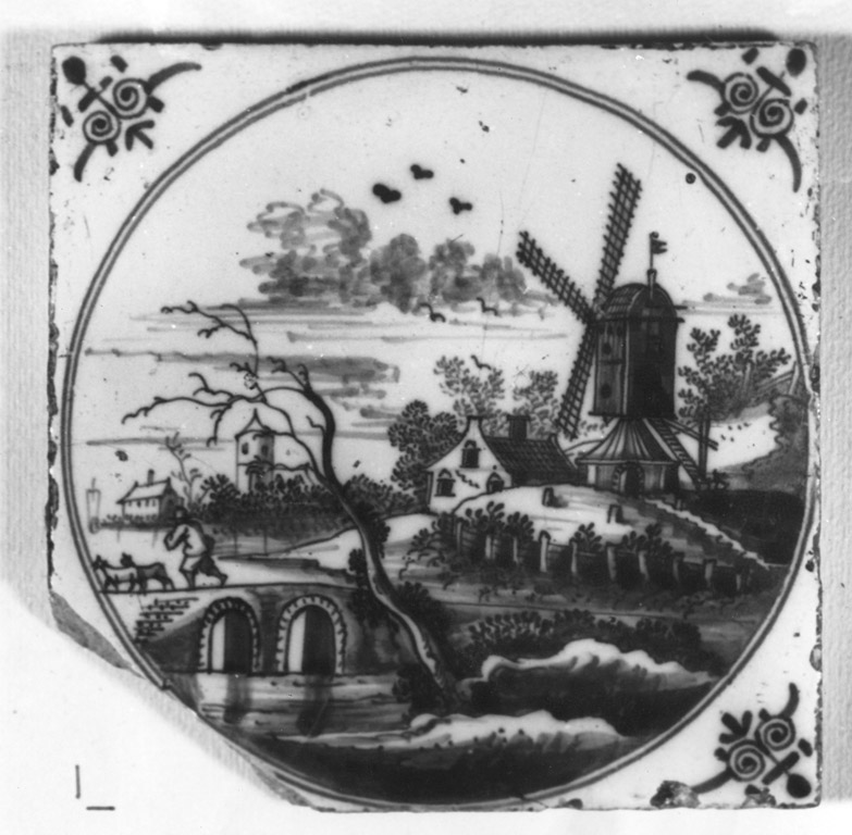 Mattonella decorata in cobalto con una raffigurazione racchiusa in un cercho delimitato da una doppia riga.. Paesaggi. Costruzioni: mulino a vento; ponte; case. Figure