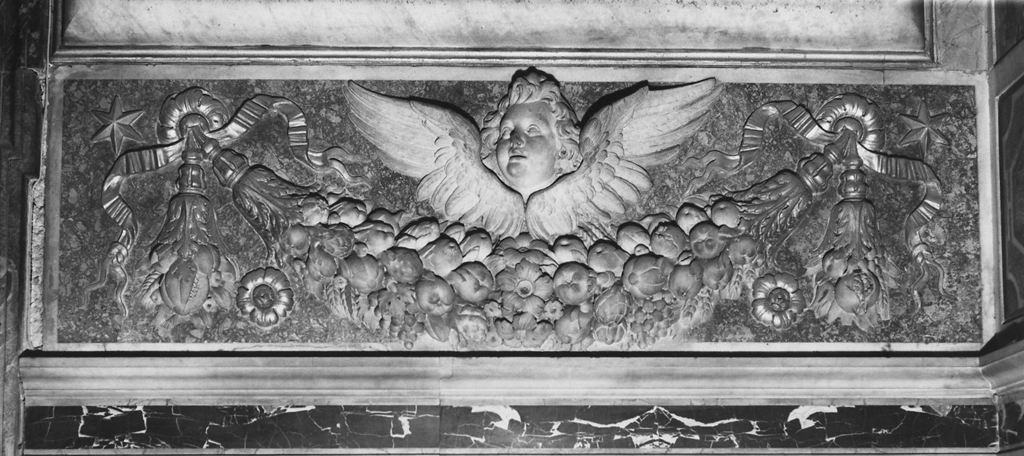 Cherubino tra fiori e frutta (decorazione plastica, serie)