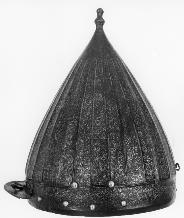coppo conico, percorso da scanalature verticali, cno breve tesa, forata per il passaggio del nasale, che manca, come i guanciali e la gronda. Decorazione incisa e dorata a tralci, disposta lungo l'orlo inferiore e nelle scanalature.