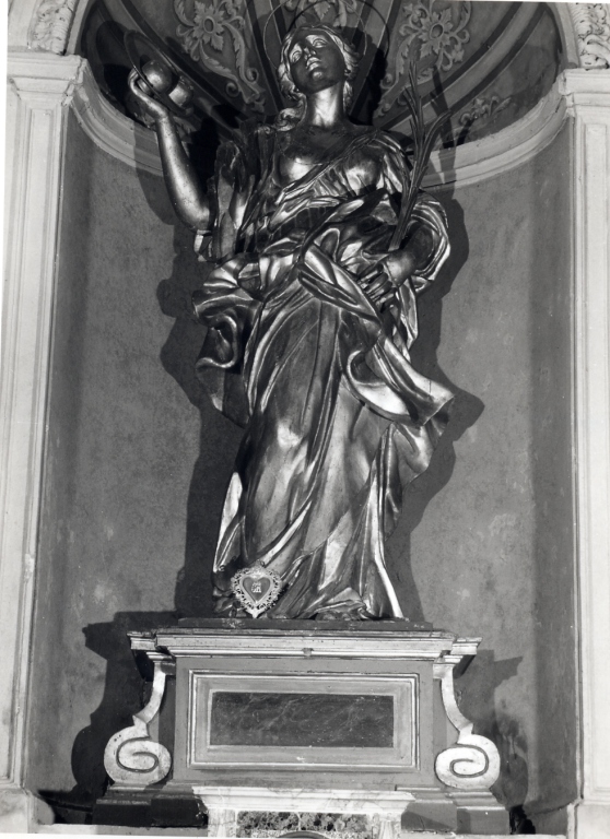 Basamento di legno quadrangolare con volute laterali, statua a tutto tondo di legno intagliato e dorato.. Personaggi: Sant'Agata. Attributi: (Sant'Agata) seni; palma del martirio
