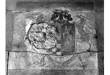 Il dipinto ha forma di lunetta. Araldica: stemma gentilizio con cimiero