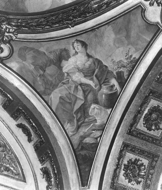 Personaggi: Rebecca. Animali: cavallo; pecora. Oggetti: botte; piatto; giara; cesto con pani. Paesaggi