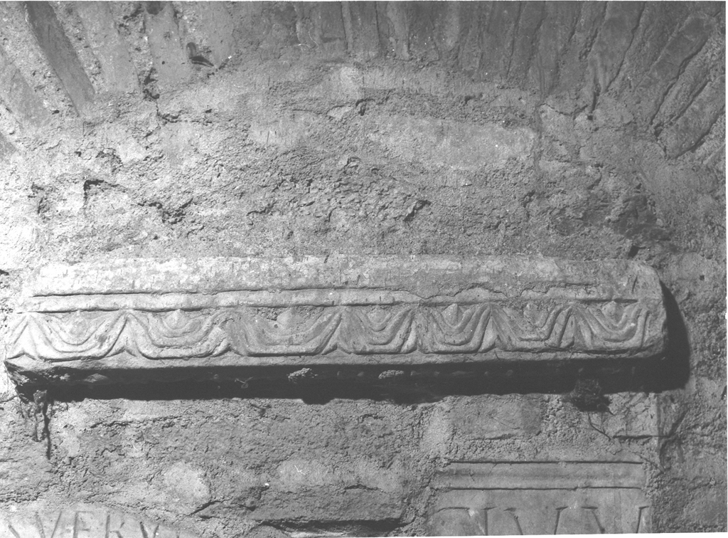Su di una superficie piana, delimitata da due listelli, compare una cimasa ionica.. Decorazioni