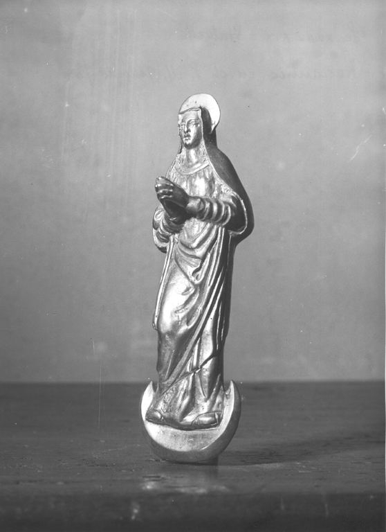 Il reliquiario a statuetta raffigura l'Immacolata Concezione. La Madonna a tutto tondo poggia sulla falce di luna; ha le mani giunte all'altezza del petto; indossa una stretta tunica e dal capo le scende un lungo velo. La statuetta si avvitava su un supporto.