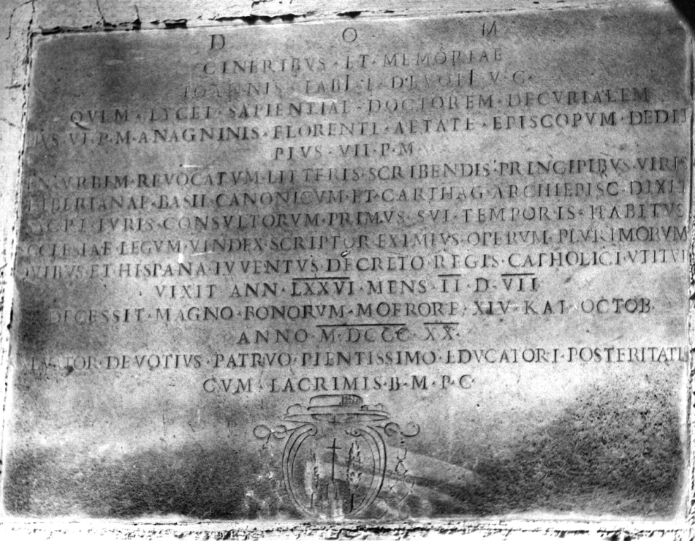 Lastra rettangolare iscritta.. Araldica: stemma del Cardinal Fabi. Araldica: stemma