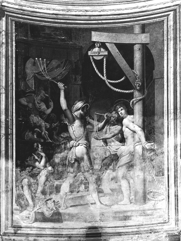 personaggi: san Gervasio; figure: carnefici; imperatore; oggetti: flagelli ; palo di tortura