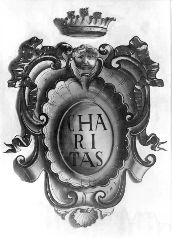 ovale con la scritta CHARITAS entro scudo a cartoccio con nastrii e piccola testa alata sormontata da corona. Araldica: emblema dell'ordine dei Minimi