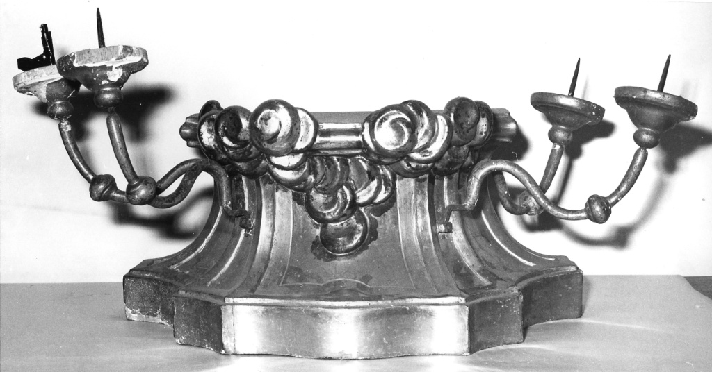 Base: mistilinea, con specchiature. Serie di quattro bracci portacandele. Decorazione: a nuvolette stilizzate.