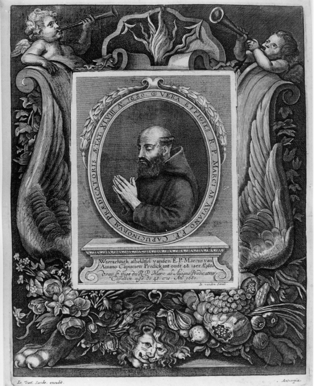Ritratti: Marco d'Aviano. Abbigliamento religioso: saio dei frati minori cappuccini. Figure: angeli. Animali: leone. Decorazioni: festone