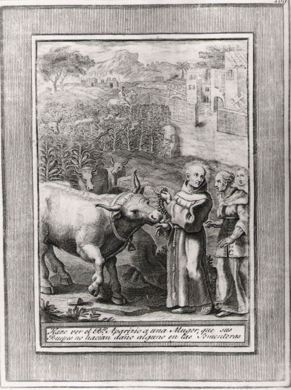 haze ver el b.to Aparizio a una muger, que..., beato Sebastiano di Aparicio assicura una donna che i suoi buoi non recano danno ai campi seminati (stampa, serie)