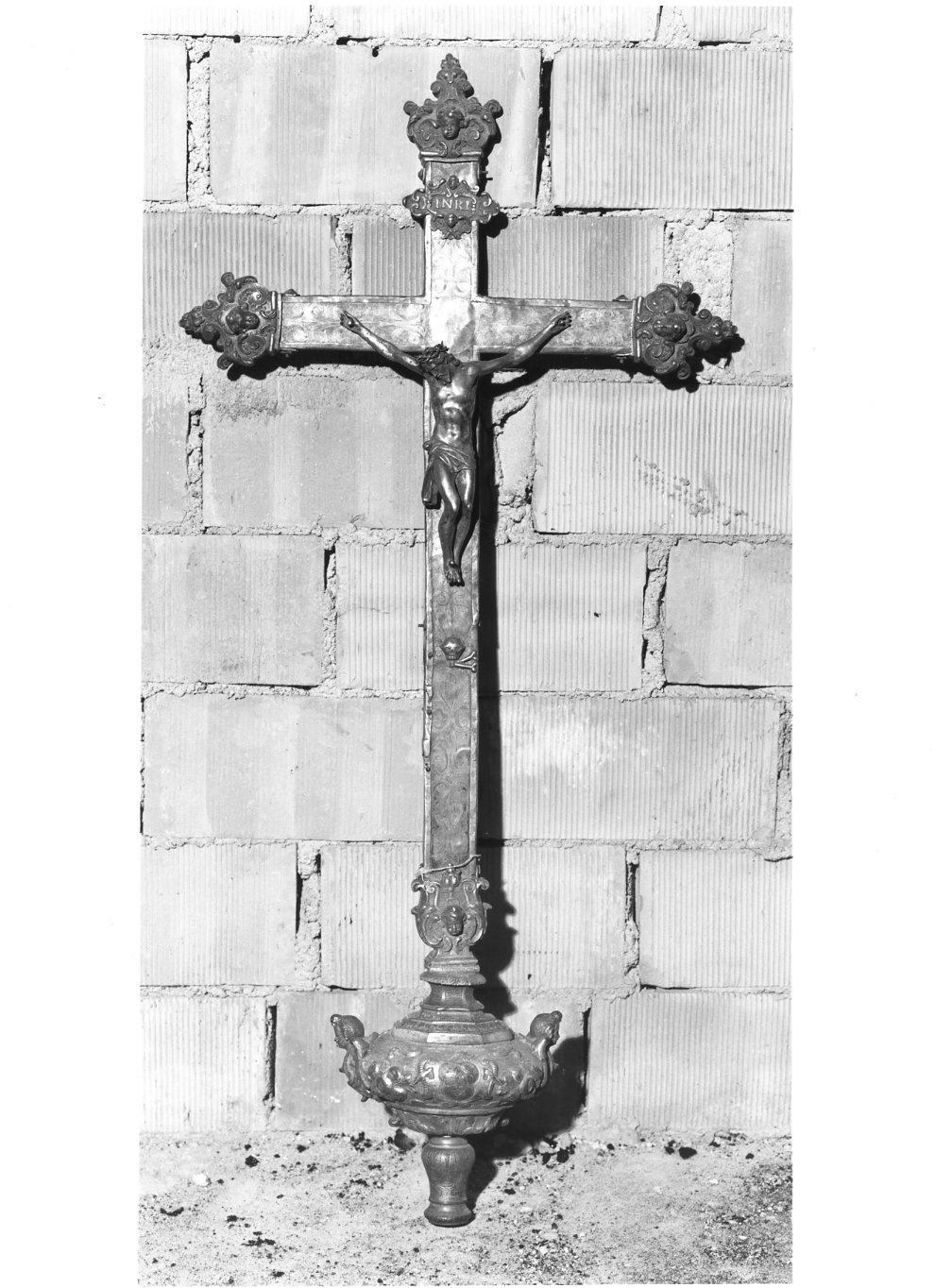 Croce processionale con la figura del Cristo applicata su fondo cesellato a ornati; i terminali recano teste di puttino tra volute, il nodo rigonfio ha due testine alate laterali e campi a sbalzo e cesello.