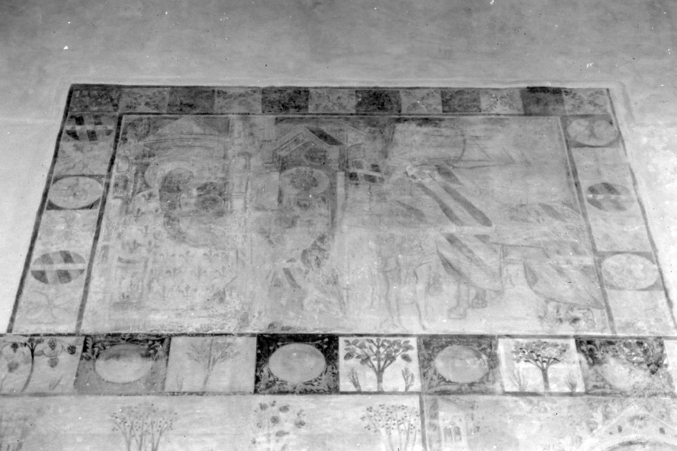 Madonna in trono con Bambino, santo coronato e corteo di cavalieri