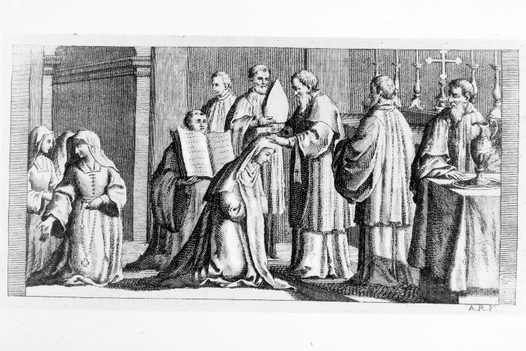 cerimonia di benedizione di una badessa: imposizione delle mani (stampa)