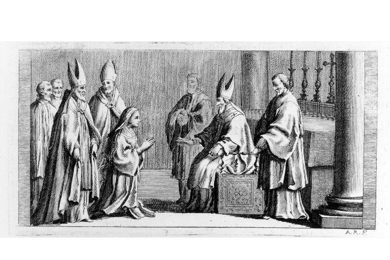 cerimonia di investitura di una sovrana: genuflessione (stampa)