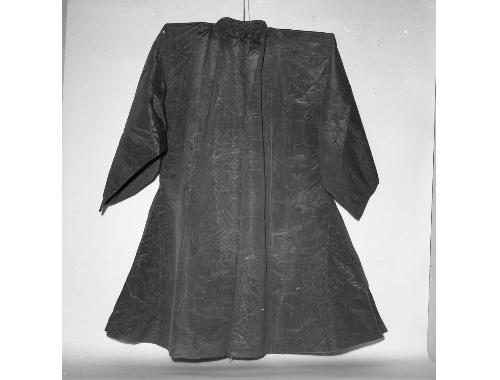 La cappa, in moire di seta viola, è operata sul davanti, con una leggera arricciatura intorno al collo e ampie maniche.
