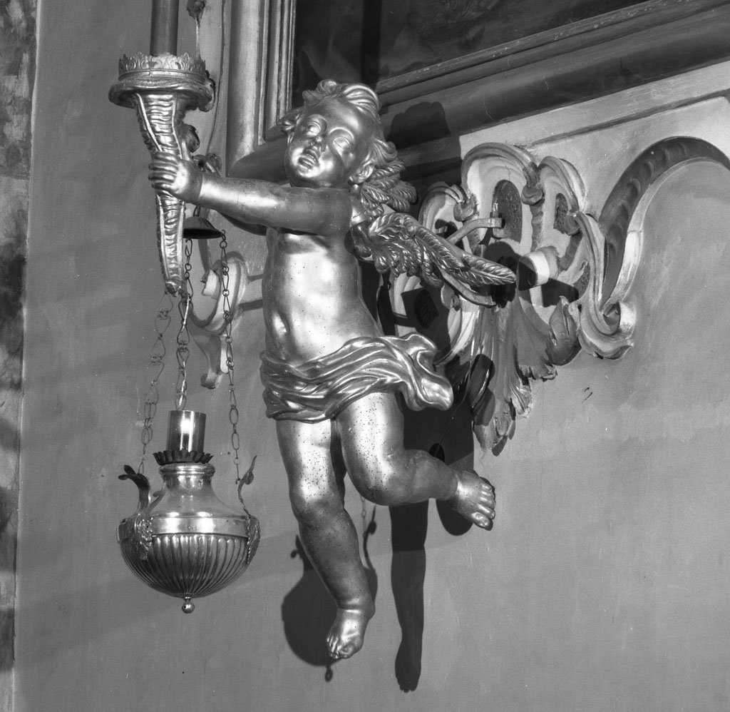 Coppia di angeli in legno dorato, scolpiti a tutto tondo, sorreggenti con la mano destra una cornucopia dove è inserita la candela.