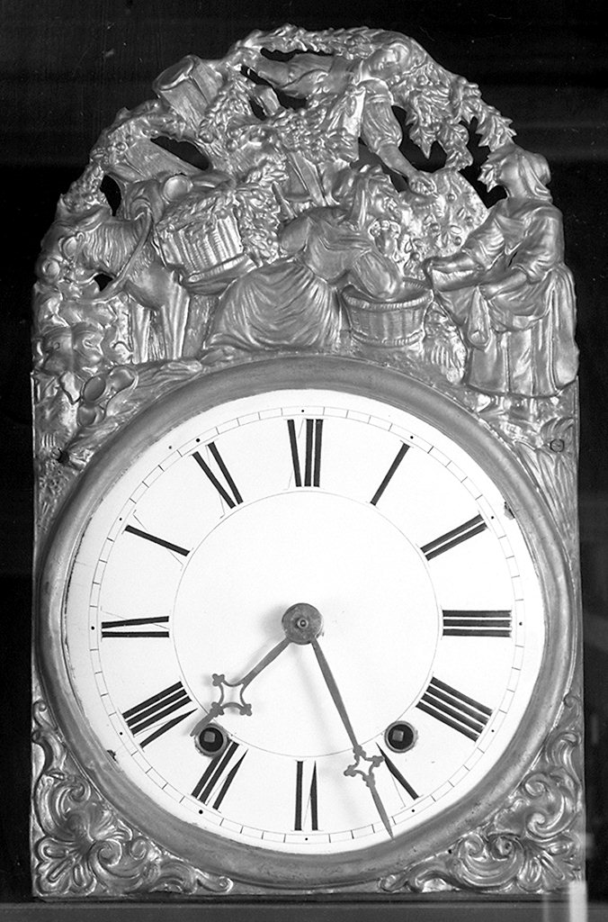 orologio a pendolo con quadrante rotondo, cornice in metallo sbalzato raffigurante "la raccolta delle olive"