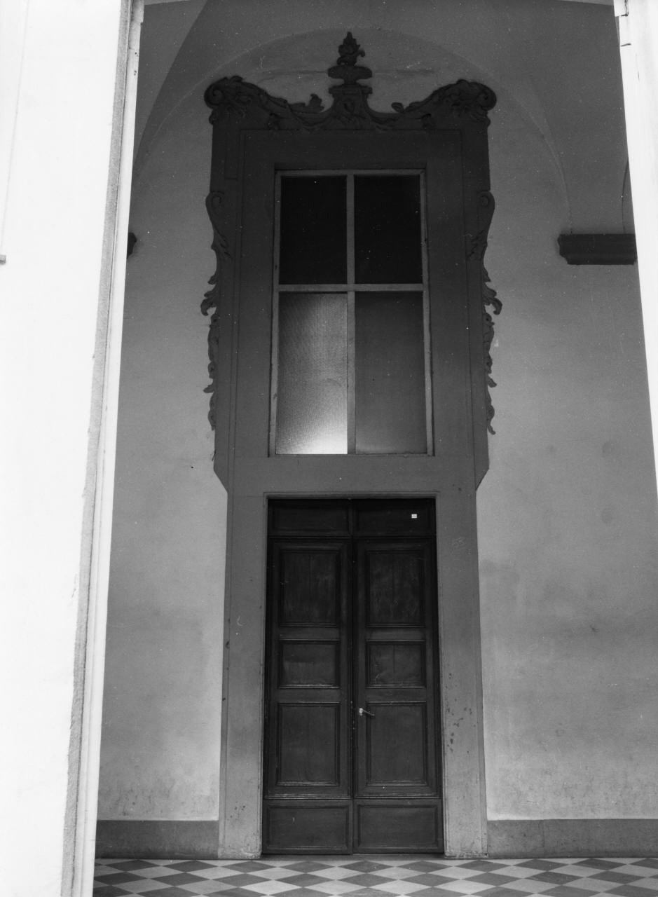 Il portale in legno scorniciato e dipinto ha una semplice cornice in muratura dipinta di grigio che prosegue verso l'alto intorno ad un finestrone. Tutt'intorno vi è una decorazione in stucco dipinto in grigio con volute vegetali inquadranti al centro un vaso fiammato.