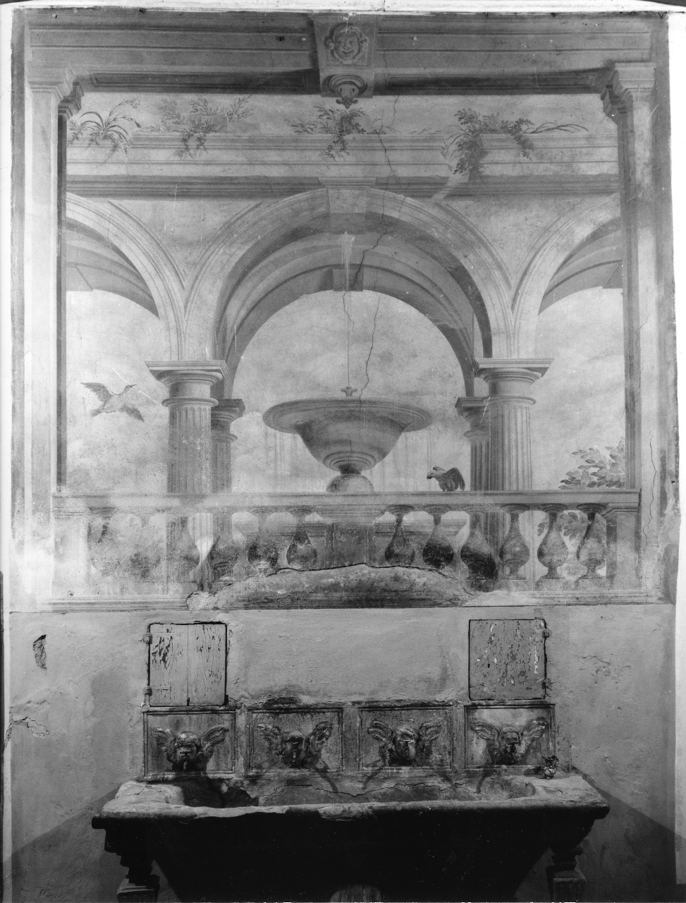 veduta prospettica di architettura con loggiato, balaustra e fontana