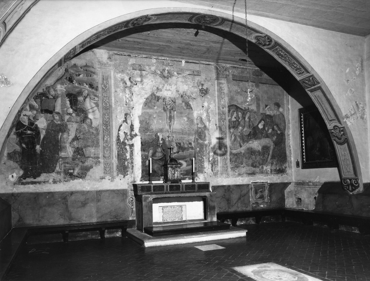 Soggetti sacri. Personaggi: Cristo; Madonna; Santa Maria Maddalena; San Giovanne Evangelista; Nicodemo. Figure femminili: pie donne. Figure maschili: cavalieri; carnefici; spettatori; angeli. Animali: cavalli. Piante: alberi. Vegetali. Paesaggi: paesaggio collinare. Costruzioni. Vedute: città. Abbigliamento religioso