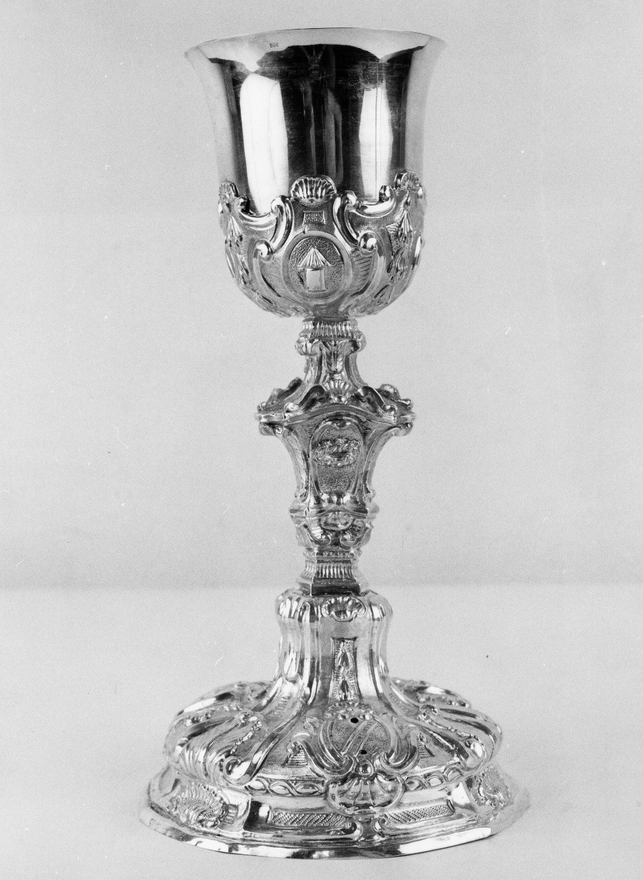 Piede a base circolare bombata; fusto modanato a sezione circolare con nodo sagomato; sottocoppa decorata e coppa liscia. Conchiglie e volute vegetali si ripetono idententiche su tutto il pezzo come motivo decorativo di fondo, metre i Simboli della Passione spiccano entro scudi ovali. Interno della coppa dorato.. Soggetti sacri. Simboli della passione: dadi; scala; colonna; chiodi; tenaglie; corona di spine; flagelli; croce; lanterna
