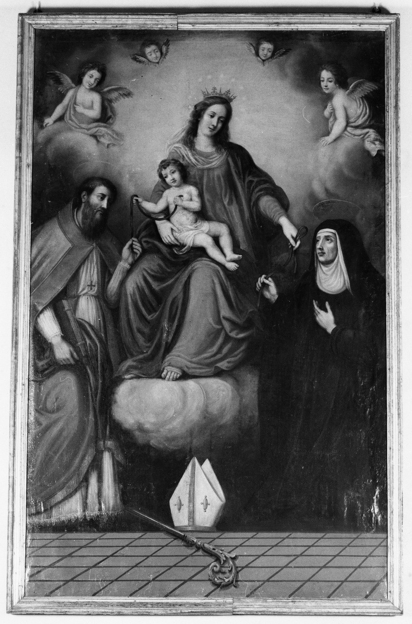 Soggetti sacri. Personaggi: Madonna; Bambino; Sant' Agostino; Santa Monica. Figure: angeli; cherubini. Attributi: (Sant' Agostino) libro. Simboli: (Castità) sacra cintola. Abbigliamento religioso: piviale; mitria; pastorale. Oggetti: corona. Elementi architettonici: pavimento. Fenomeni metereologici: nuvole