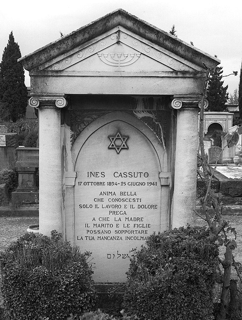 Il monumento presenta un'edicola costituita da due colonne ioniche che sostengono una trabeazione liscia sormontata da un timpano triangolare all'interno del quale si trova un rilievo raffigurante un menora'. Sulla lastra a terra sono appoggiati quattro vasi portafiori.. Simboli: (etnico-religioso) stella di David. Simboli: (religioso) menorà