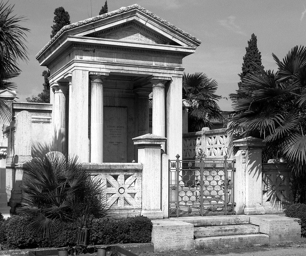 Il monumento presenta una struttura articolata costituita da un ampio recinto con alte transenne. All'interno lo spazio e' distribuito tra una piazzola anteriore su cui si trovano lastre tombali ed un tempietto con colonne scanalate, rastremate e capitello dorico; il timpano e' triangolare. All'interno del tempietto la parete di fondo e' occupata da due lastre murate in verticale.