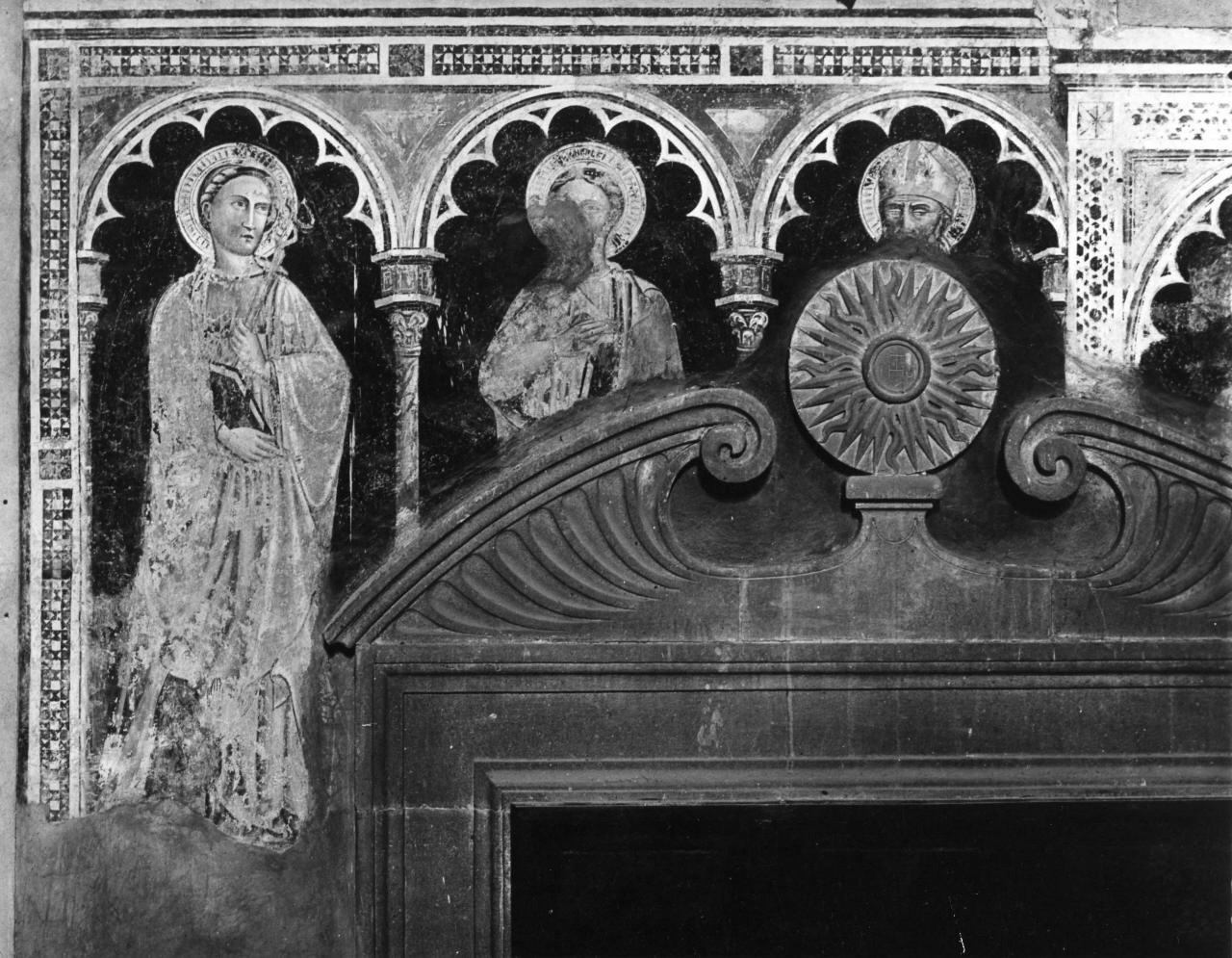 Soggetti sacri. Personaggi: Santa Apollonia. Figure femminili: santa. Figure maschili: committente; santo vescovo. Attributi: ( SANTA APOLLONIA ) tenaglie; ( SANTA APOLLONIA ) chiostra dentaria. Abbigliamento religioso. Elementi architettonici: archi polilobati