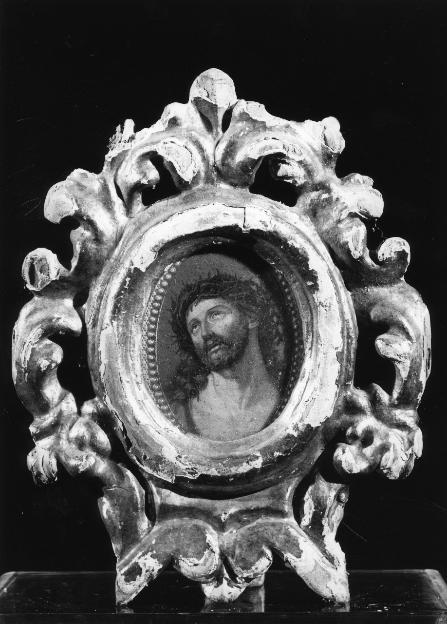 Pace decorata da riccioli e volute, mantenuta in posizione verticale da un sostegno posteriore. All'interno è una stampa raffigurante il volto di Cristo.