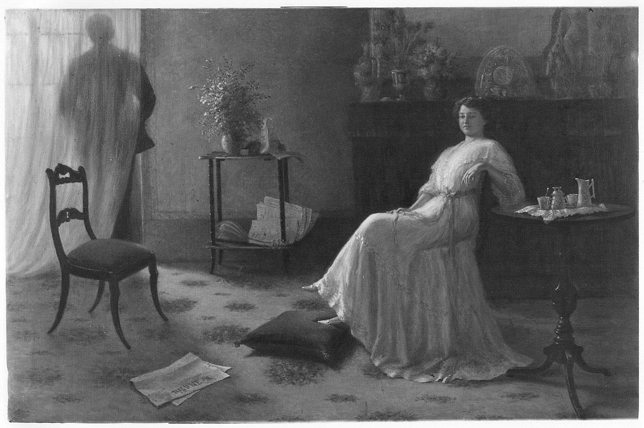 Dipinto.. Soggetti profani. Figure: giovane donna; uomo. Abbigliamento. Oggetti: cuscino; servito da caffè; specchio; vasi di fiori; soprammobili; tappeto; giornale; tenda. Mobilia: sedie; tavolini; credenza