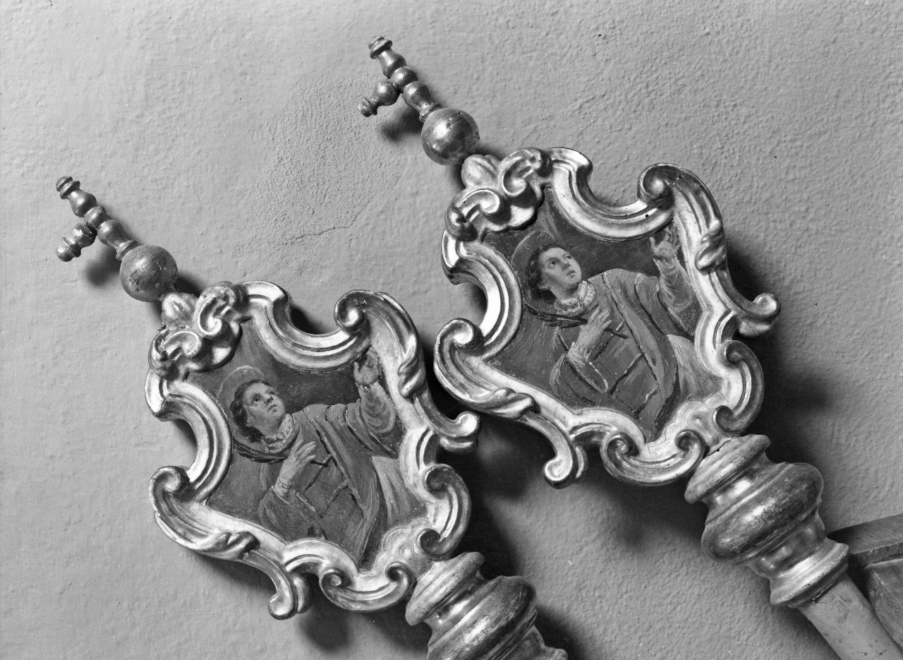 Insegne di confraternita in legno intagliato e dorato; la parte superiore è decorata con riccioli e volute che formano una cornice intorno all'immagine dipinta a tempera di Santo Stefano a mezzo busto; mentre sul retro è dipinto il calice con l'ostia. Croce apicale con bracci uguali.. Personaggi: Santo Stefano. Attributi: (Santo Stefano) tonacella. Simboli: (martirio) ramo di palma