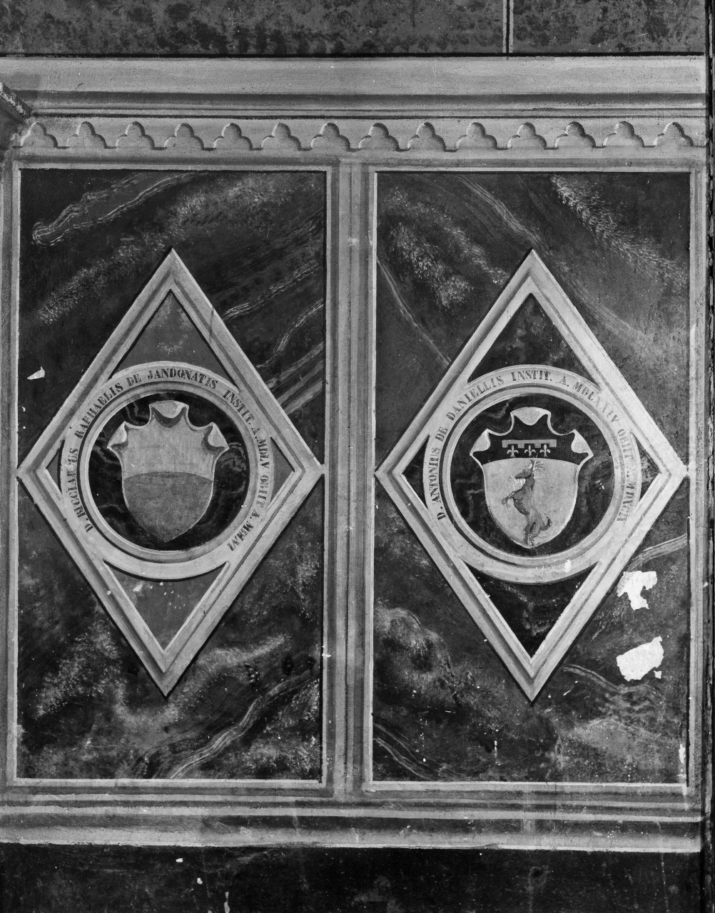 Decorazioni: specchiature; finto marmo; cornice modanata; dentellatura. Araldica