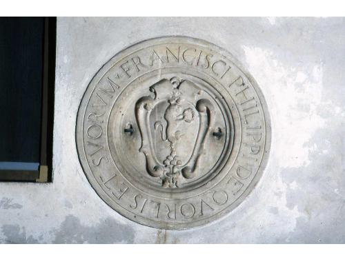 Chiusino in marmo bianco scolpito con stemma e iscrizione .. Araldica: arme della famiglia Quorli. Decorazioni: cornice circolare