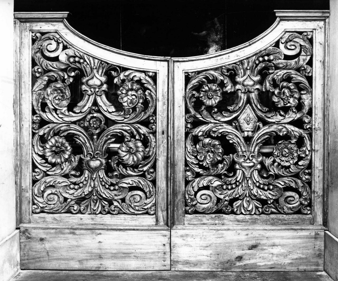 Cancello a due battenti, in legno, riccamente decorato a giorno.. Decorazioni. Vegetali: foglie. Fiori: rosette. Oggetti: mitra; pastorale