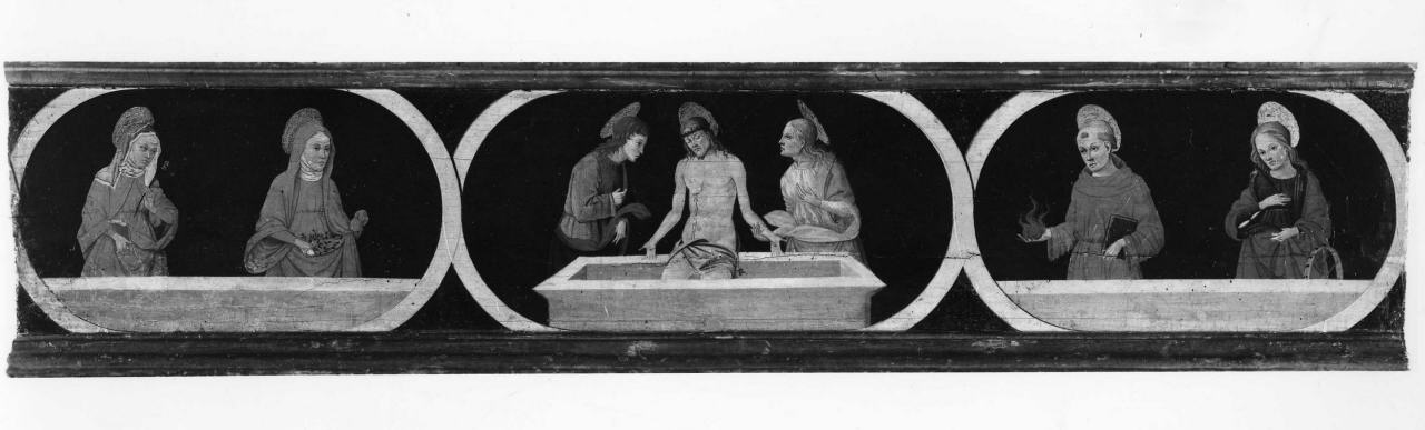 La predella presenta tre gruppi di figure, racchiuse entro medaglioni ovali: al centro è Cristo emergente dal sarcofago, tra i SS. Giovanni Evangelista e Maria Maddelena; a sinistra le SS. Chiara e Elisabetta; a destra S. Caterina d'Alessandria e S. Bernardo.