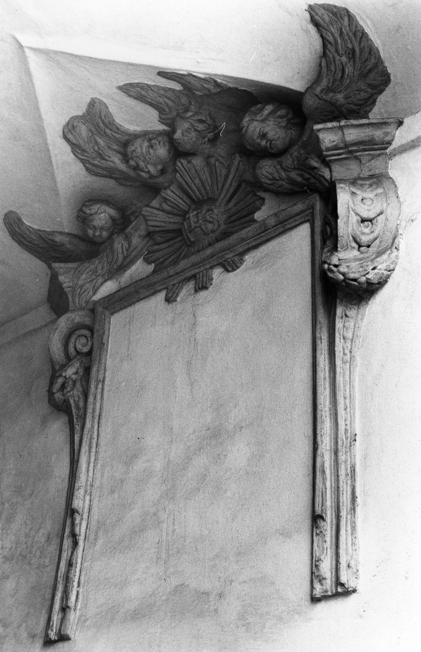 Consiste in cornice a volute sormontata da timpano formato da quattro puttini alati.