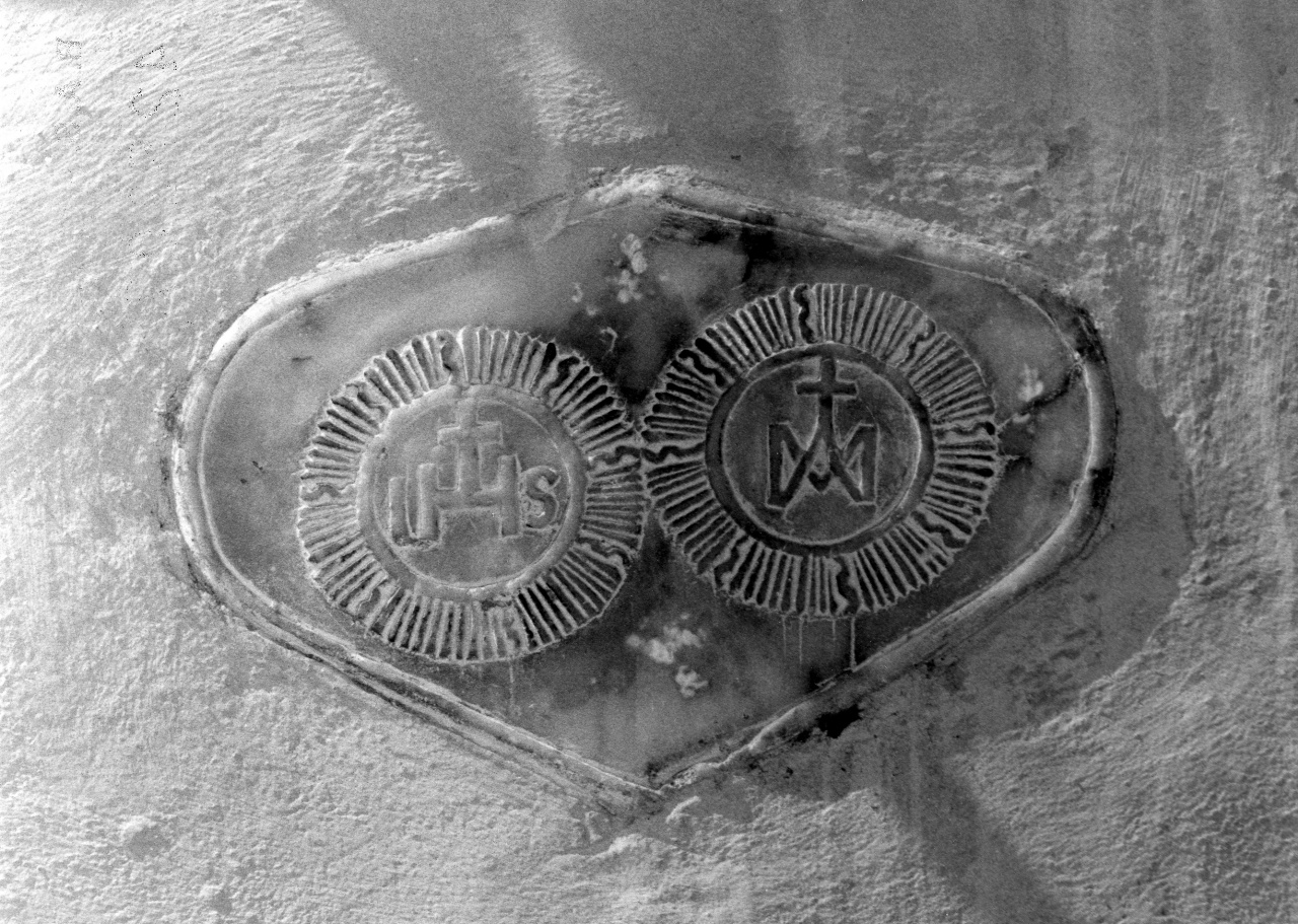 Lastra di piccole dimensioni con cornice leggermente rilevata con il monog ramma eucaristico e i simboli mariani racchiusi entro raggiere a rilievo.. Simboli: monogramma eucaristico; simboli mariani