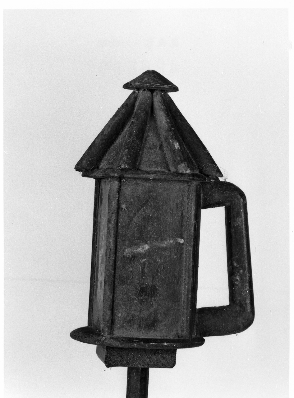 Lanterna a base circolare con quattro sportellini con finestrelle rettango lari. Cupolino semiconico con costoloni. Maniglia applicata lateralmente.. Simboli della passione: lanterna