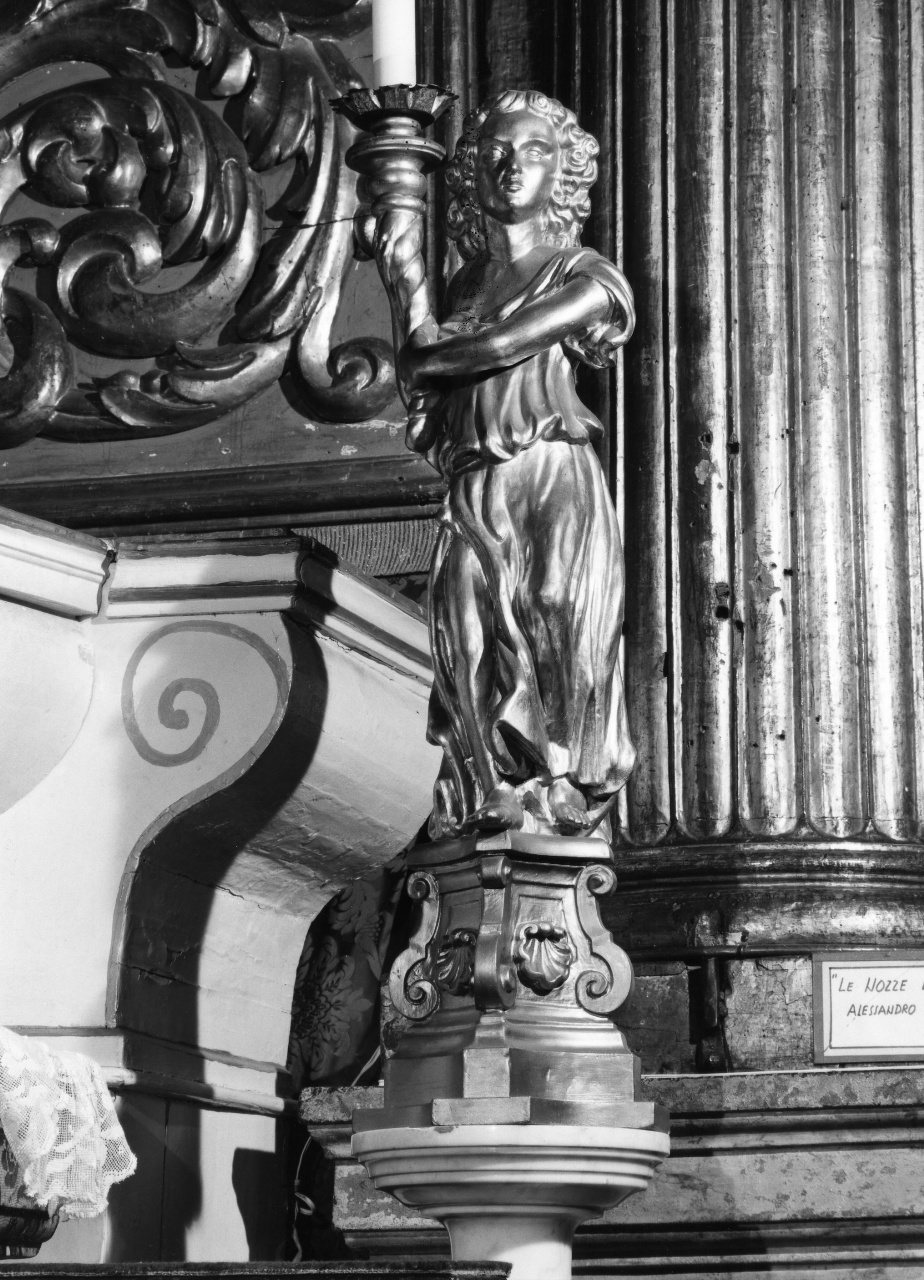 Coppia di angeli in legno intagliato e dorato, le cui braccia sorreggono una cornucopia avente la funzione di torciera. La base decorata agli angoli da volute ha al centro una serie di valve.. Soggetti sacri. Figure: angelo. Oggetti: cornucopia. Decorazioni: valve di conchiglia; volute
