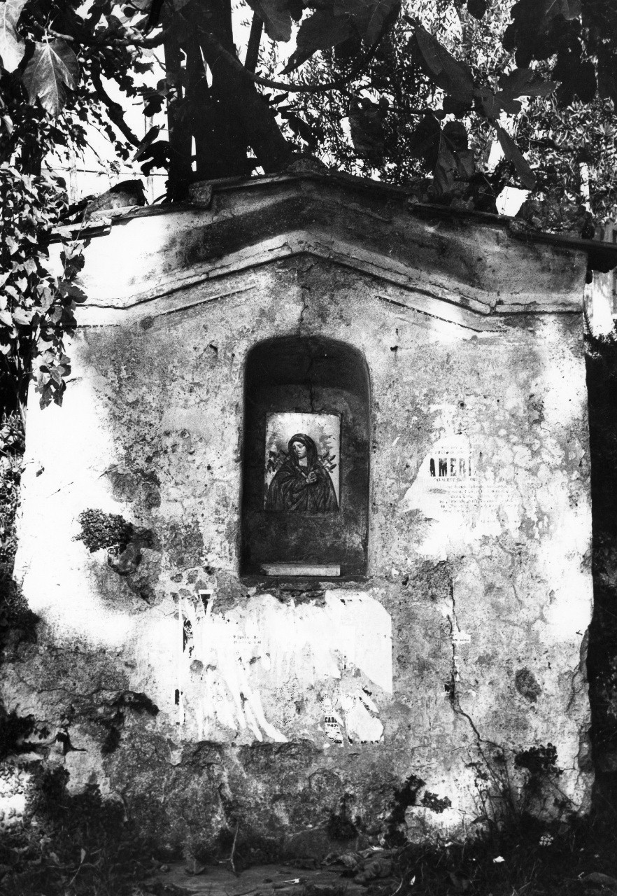 Edicola con copertura a capanna, contenente tabernacolo archirotondo con intradosso ad arco ribassato e strombato, ricavato nello spessore murario.. Personaggi: Madonna dei Sette Dolori