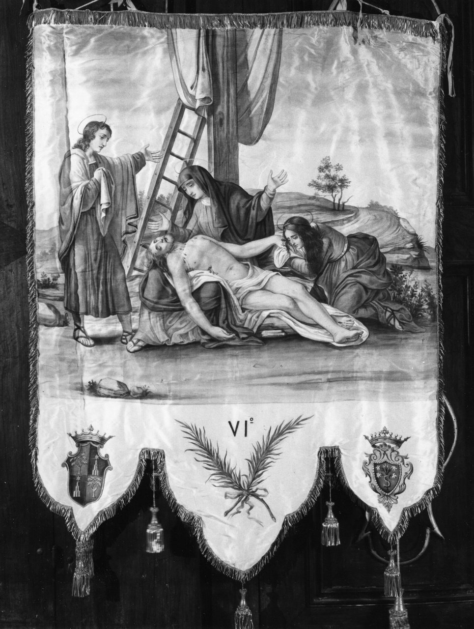 Lo stendardo ha frange e nappe dorate.. Soggetti sacri. Personaggi: Cristo; Madonna; Santa Maria Maddalena; San Giovanni evangelista. Oggetti: croce; scale. Paesaggi