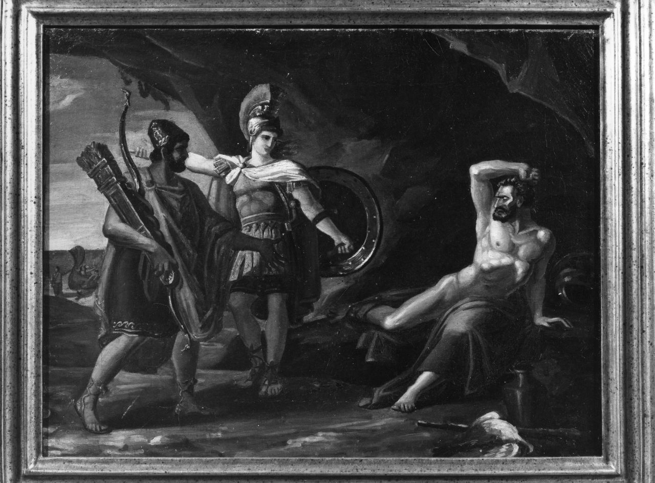 Soggetti profani. Personaggi: Ulisse; Filottete; Neottolemo. Attributi: (Ulisse) arco; faretra. Figure maschili: guerrieri. Armi. Oggetti: brocca. Mezzi di trasporto: nave. Paesaggi: paesaggio rupestre; paesaggio marino. Abbigliamento: abbigliamento militare all'antica