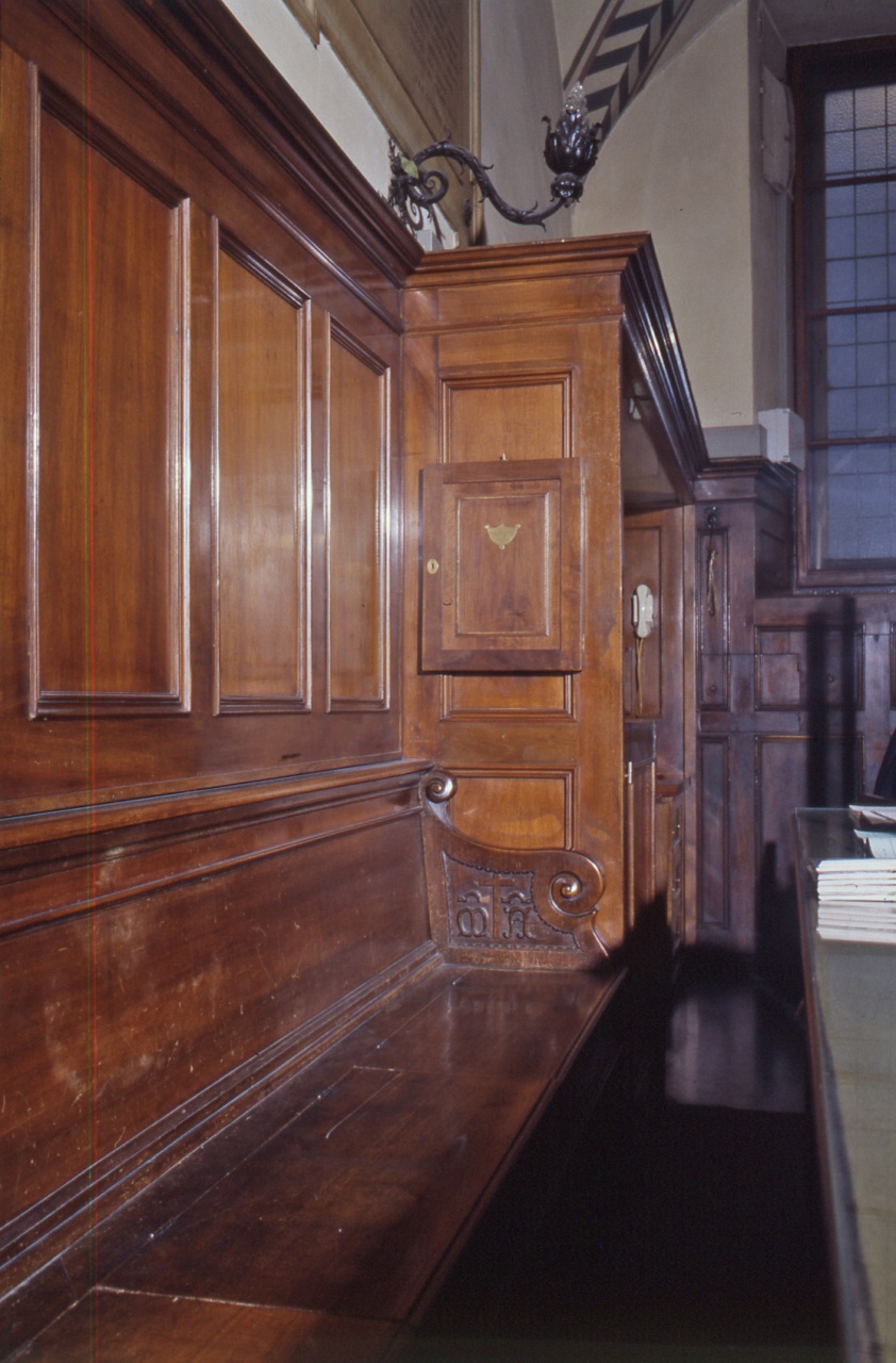 Coppia di braccioli in noce, a doppia voluta, intagliati sul dorso da file di bisanti e sul fianco con l'emblema della misericordia entro cornice di mezzi bisanti. Frammenti di un' arci banco; ora inseriti in una cassapanca.. Araldica: emblema corporativo dell'Arciconfraternita della Misericordia