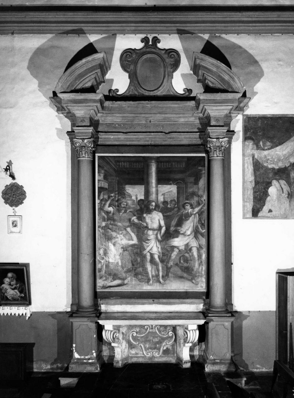 I quattro altari poggiano su uno zoccolo di base sormontato da due plinti laterali che sorreggono due colonne di ordine corinzio. La trabeazione, interrotta nella zona centrale, sostiene un timpano ad arco spezzato sormontato da un medaglione ovale con cornice ansata. La mensa si inserisce sullo zoccolo di base fra i due plinti laterali e poggiano su due mensole decorate da volute. La stessa forma architettonica è condivisa da tutti gli altri ad eccezione del secondo altare sulla parete laterale sinistra (cfr. scheda con foto n. 372633). tutti gli altari contengono nella zona rettangolare centrale dei dipinti.. Decorazioni: motivi decorativi architettonici; motivi decorativi a volute
