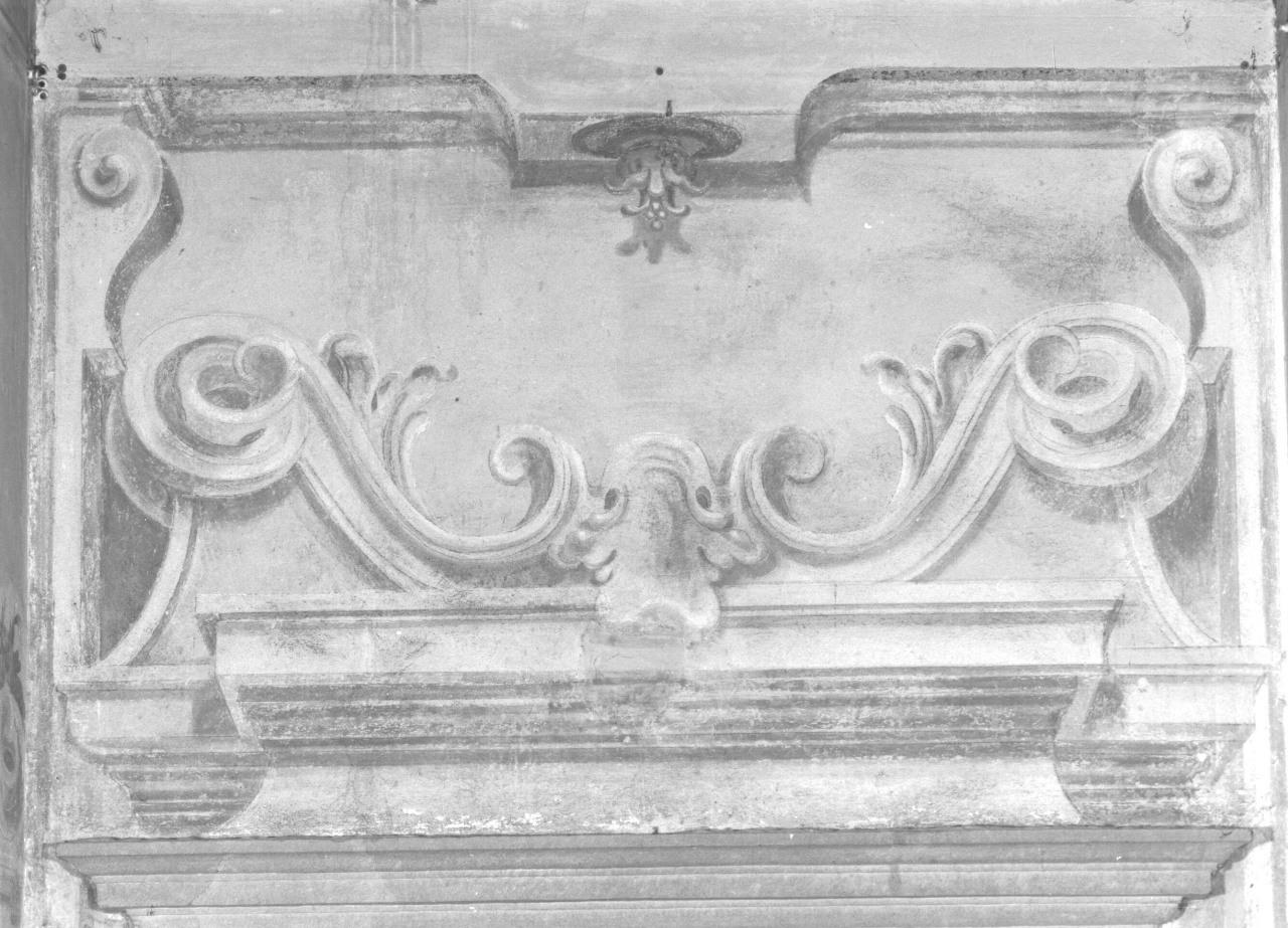 Affresco raffigurante architetture, architravi con volute e foglie di acanto.. Architetture: elementi architettonici. Decorazioni