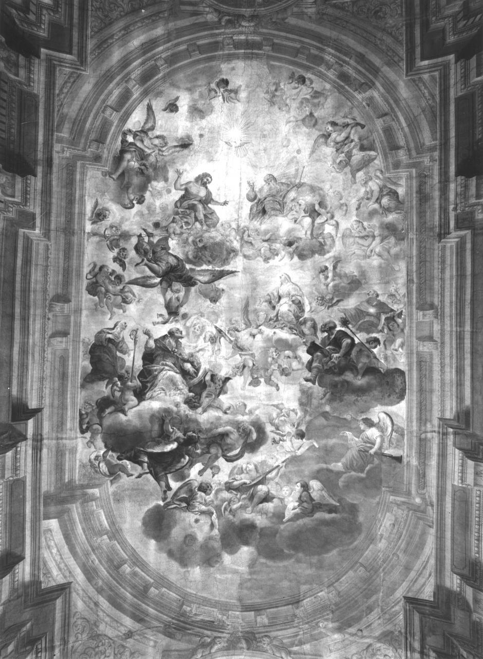 Personaggi: Cristo; Dio; Madonna; Santa Maria Maddalena dei Pazzi; Sant'Agostino; San Giuseppe; San Tommaso d'Aquino. Simboli: (Spirito Santo) colomba. Figure: angeli; cherubini. Oggetti: cartigli. Strumenti musicali. Abbigliamento religioso: abito da carmelitana; piviale; abito da domenicano. Attributi: (Sant'Agostino) libro. Attributi: (San Giuseppe) mazza fiorita; libro. Attributi: (San Tommaso d'Aquino) stella sul petto; libro; giglio. Insegne ecclesiastiche: mitra; pastorale
