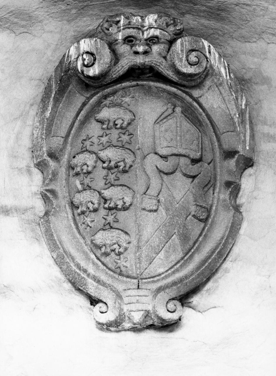 Stemma in pietra serena con scudo. La cornice presenta mascherone e volute a ricciolo.. Araldica
