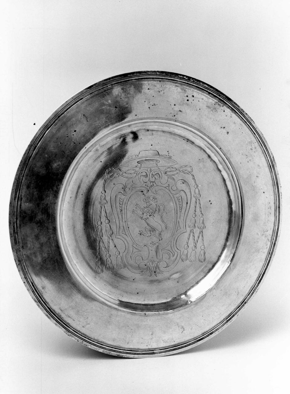 Vassoio di forma circolare con al centro, inciso, lo stemma della famiglia Acciaiuoli; lo stemma è racchiuso da una cornice sagomata a volute e sormontata da galero a tre ordini di nappe.. Araldica