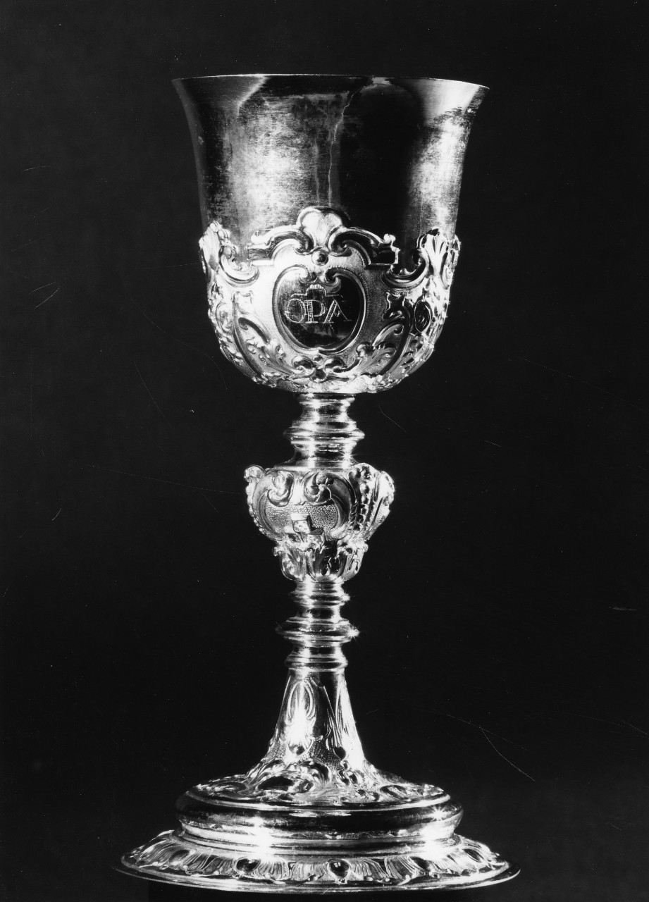 Calice in lamina d'argento sbalzata e cesellata, con piede circolare bombato, con pianetto baccellato, ornato da cartigli e motivi vegetali, il nodo piriforme è racchiuso tra motivi a palmetta, alternati ai simboli della Passione. Nella parte inferiore della coppa motivi vegetali e volute racchiudono tre cartigli.. Soggetti sacri. Simboli della passione: dadi; flagelli; tunica